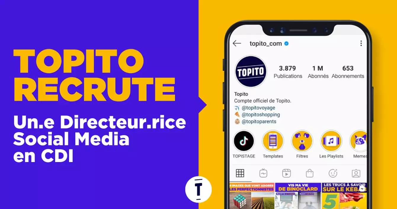 Topito est un groupe média de divertissement présent sur la totalité des réseaux sociaux existants. Chaque jour, les équipes édito publient vidéos, textes et images divertissantes et humoristiques à nos plus de 7 millions d’abonnés. Et là on recherche la personne qui pourra gérer avec son équipe social media l'ensemble de ces publications