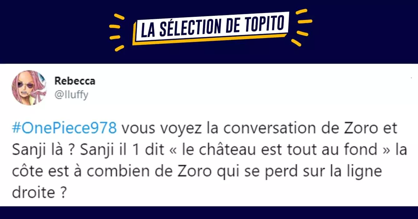 Hop, on repart sur un rendez-vous One Piece avec le 978e chapitre (on n'a pas assez de doigts pour les compter), avec les meilleurs tweets sur cette nouvelle partie encore bien cool. Au menu du jour, un Zoro pas très doué en course d'orientation, un Kinemon qui ne pense qu'au business et une belle trahison. Et pour ceux qui ont raté l'épisode 977 de One Piece, c'est dans le lien.