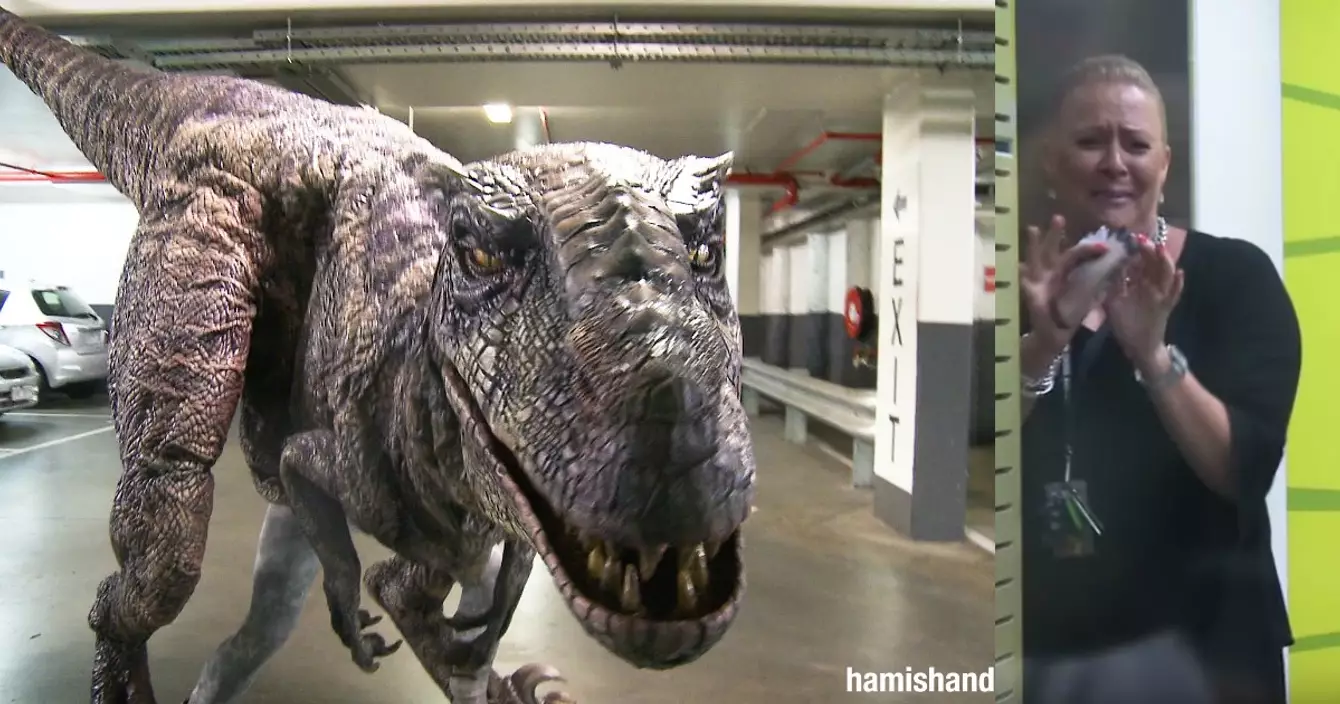 Hamish & Andy sont deux animateurs radio en Australie. Quand on leur a prété le déguisement le plus réaliste de T-Rex, ils ont décidé d'effrayer leurs collègues avec. Et ça a marché.